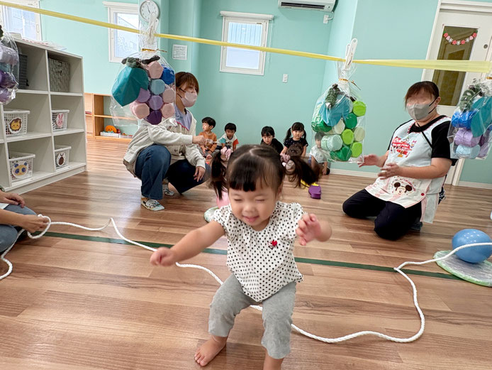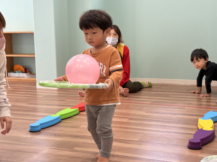 平均台を通って、ボール運びをして、波打つ縄跳びを飛んで、ブドウを収穫してゴールです。