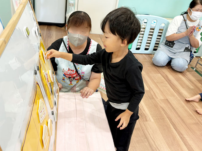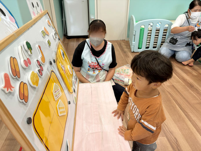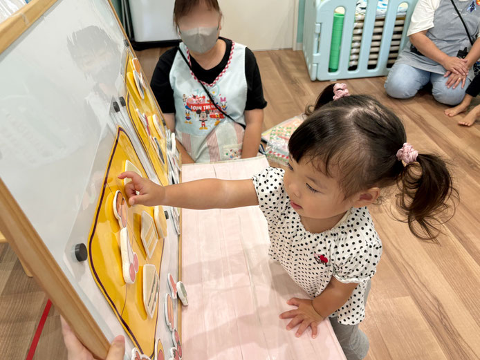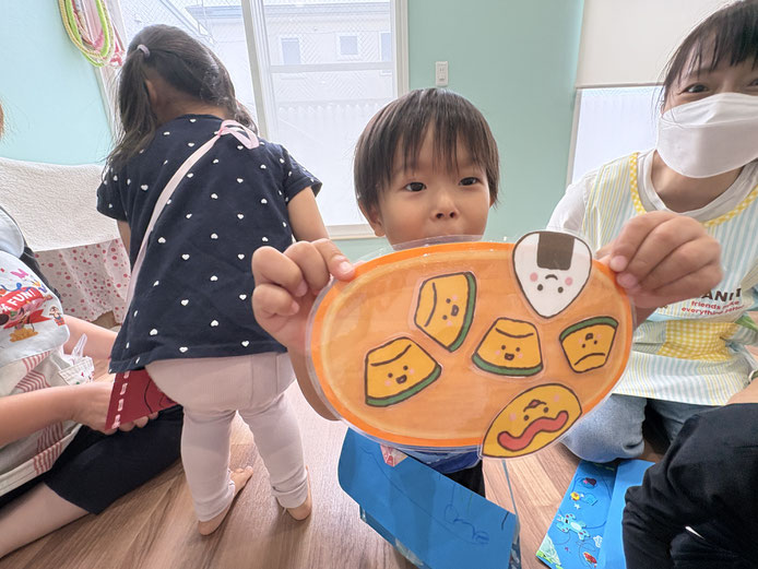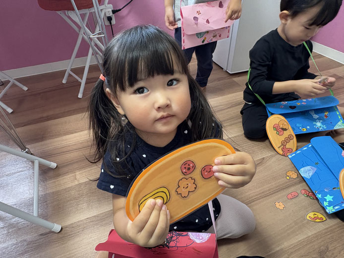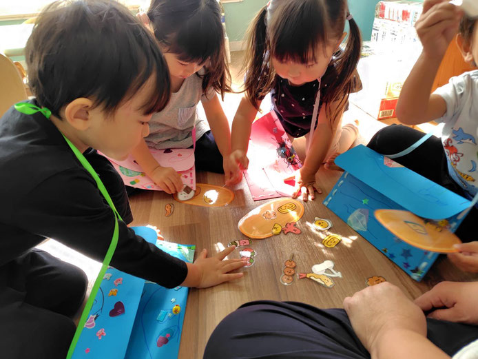 大きい組さんは隠された具もすぐに発見して、上手に自分のお弁当箱にぺたんと貼っていました。お弁当箱は上手にできたらメダルをもらいました。