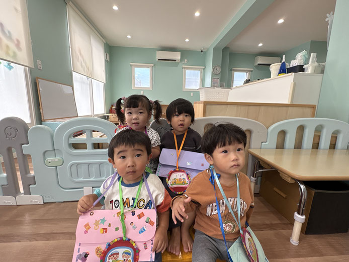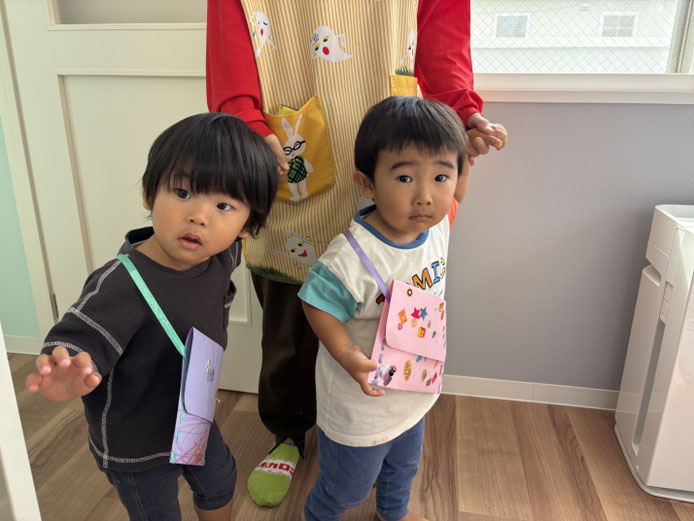 次に以前みんなが製作してくれた探検バックを持って、園内に隠されたお弁当の具を探しに探検に行きました!